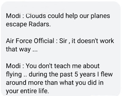 பாலகோட் தாக்குதலுக்கு முன் மேகமூட்டமாக இருப்பதால் இப்போது தாக்குதல் வேண்டாம் என்று இராணுவத் தலைமை முடிவு செய்தார்களாம் அப்போது மோடி அவர்கள் இந்திய விமானப்படைக்கு "மேகம் இருப்பதால் ரேடார் கண்ணில் மண்ணைத்தூவி எளிதில் தாக்குதல் நடத்தலாம்" என்று தான் அறிவுரை கூறியதாக மோடி பேசி இருக்கிறார்.நமக்குதான் மோடி பெரிய அறிவாளி என்று நல்லா தெரியுமே.