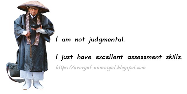 டிஸ்கி : ஒருவரின் தனிப்பட்ட மற்றும் குறிப்பாகத் தார்மீக தரங்களின் அடிப்படையில் தீர்ப்புகளைத் தவிர்ப்பது நல்லது. அது போலக் கடுமையாக அல்லது நியாயமற்ற முறையில் தீர்ப்பளிக்க வேண்டாம்:
